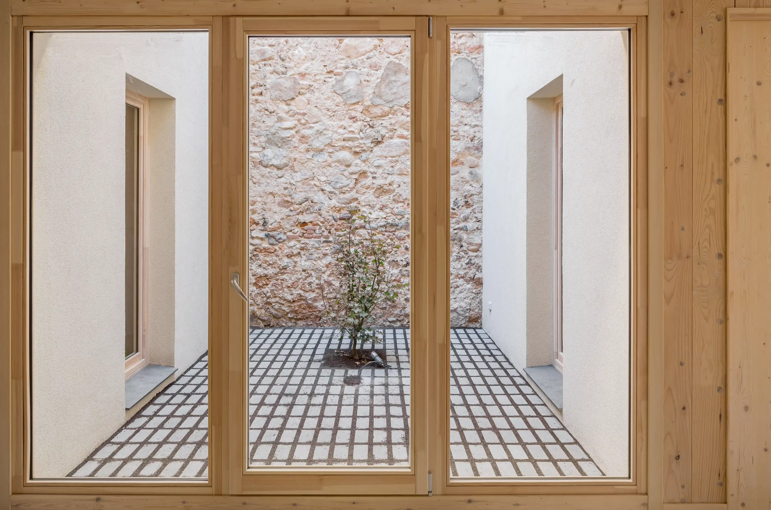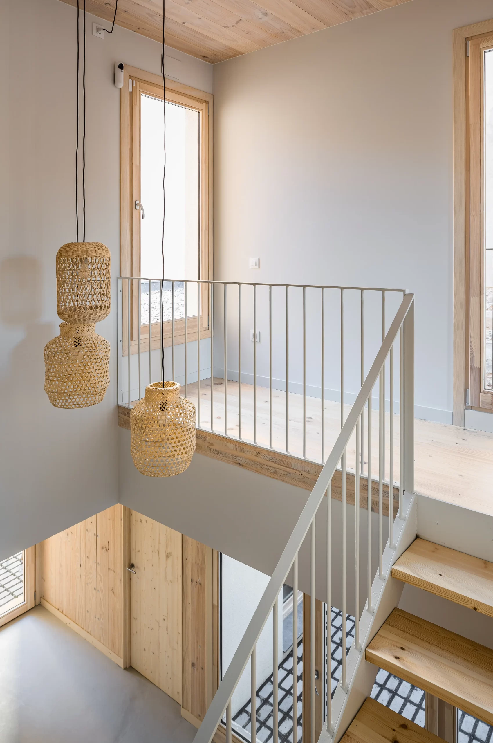 El suelo de microcemento, el sistema SATE en las fachadas y la aerotermia, junto con el innovador sistema de ventilación de doble flujo, aseguran que el aire dentro de la casa siempre sea de la mejor calidad, mientras se reduce al mínimo el consumo energético. Las ventanas de alta calidad y las persianas apilables complementan la funcionalidad y el diseño de esta vivienda entre medianeras.