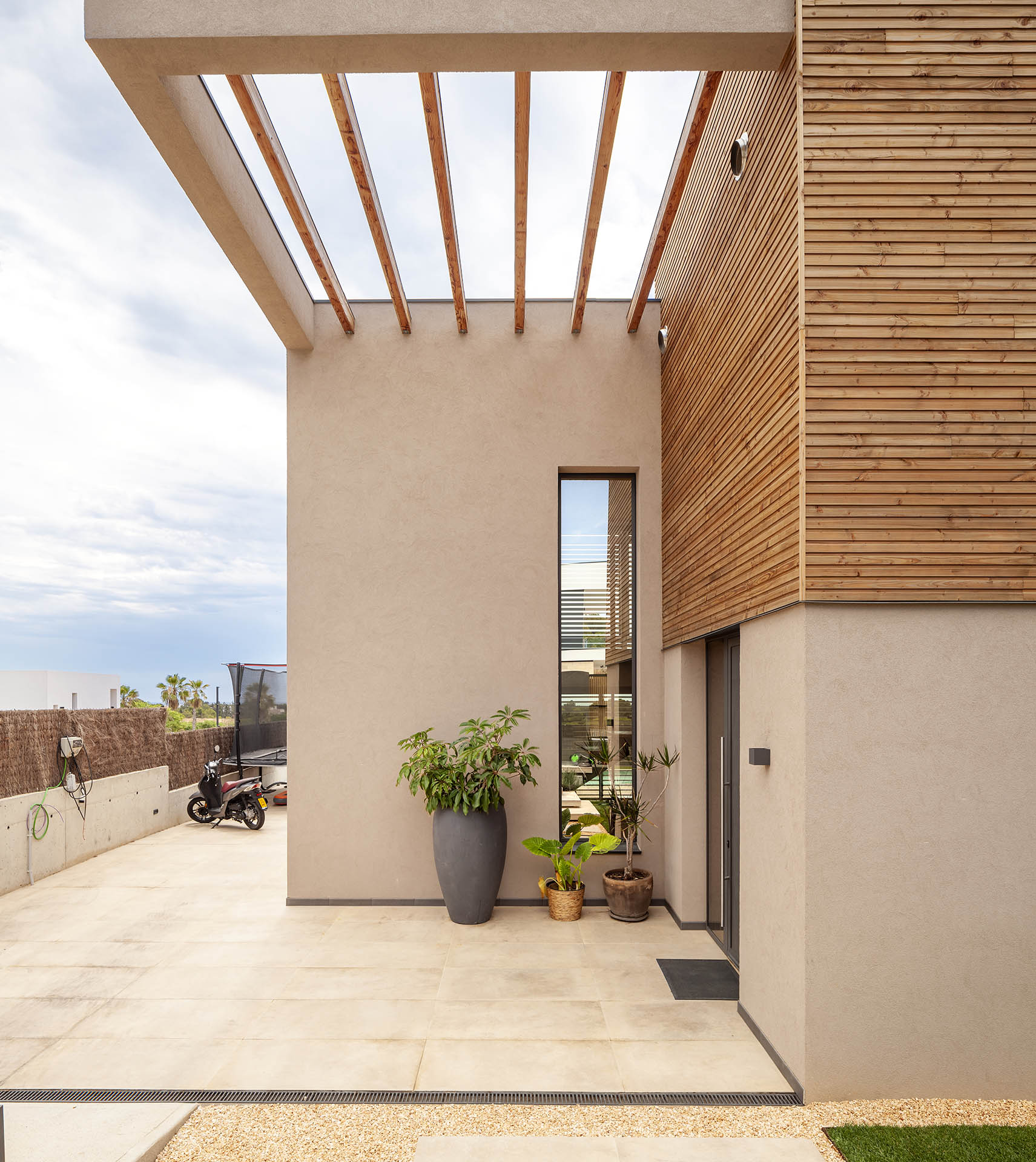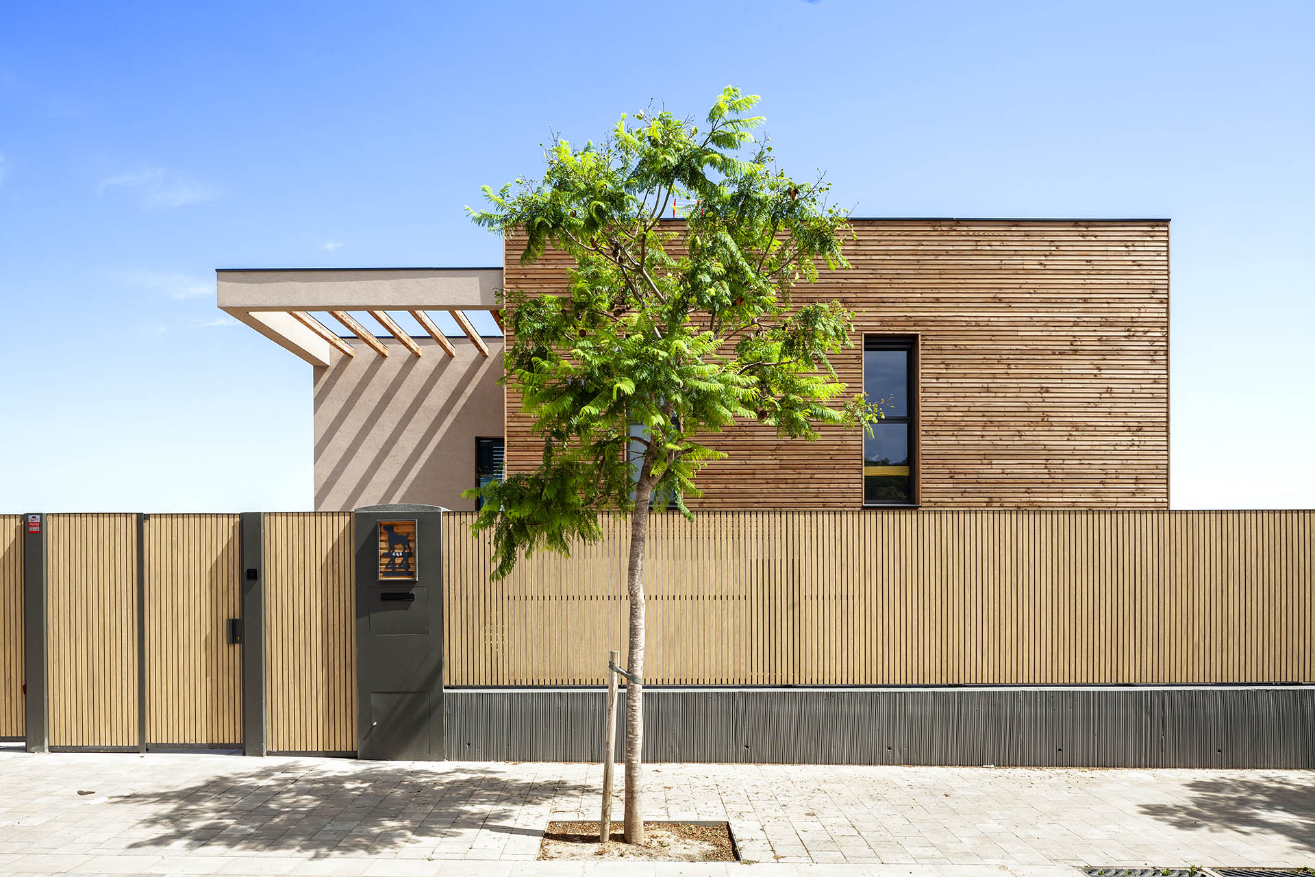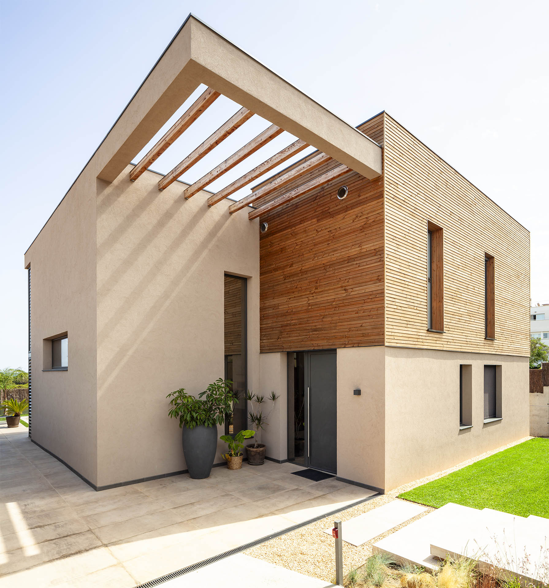El diseño de esta casa no solo se centra en la estética y la funcionalidad, sino también en el aprovechamiento de recursos renovables. Un sistema de paneles solares de 5,4 kW permite a sus propietarios disfrutar de un autoconsumo energético eficiente, minimizando la huella de carbono y maximizando el ahorro energético.